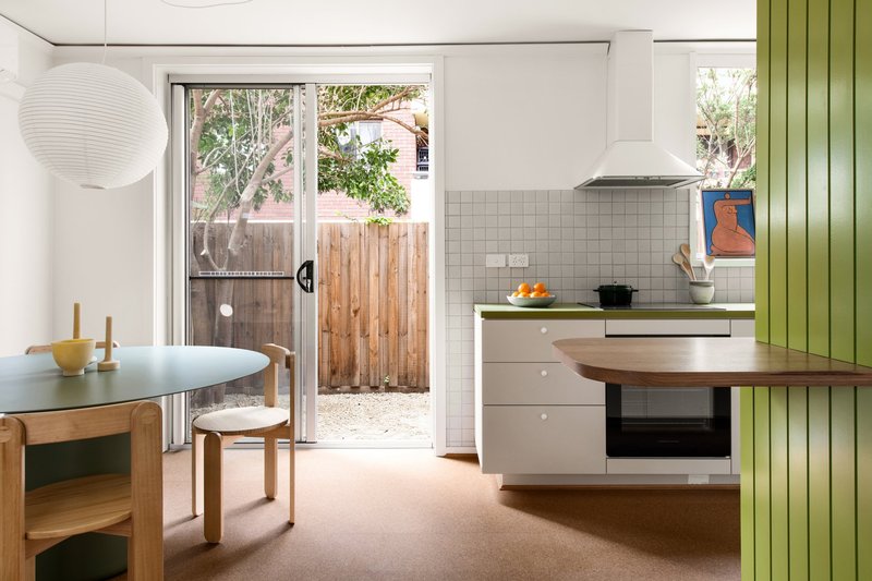 Renovated apartments boast new kitchens, lighting, and fixtures. A pleasant interior palette includes cork flooring and mosaic tiled splashbacks. The west side units feature orange accents, while the east side showcases lime green highlights.