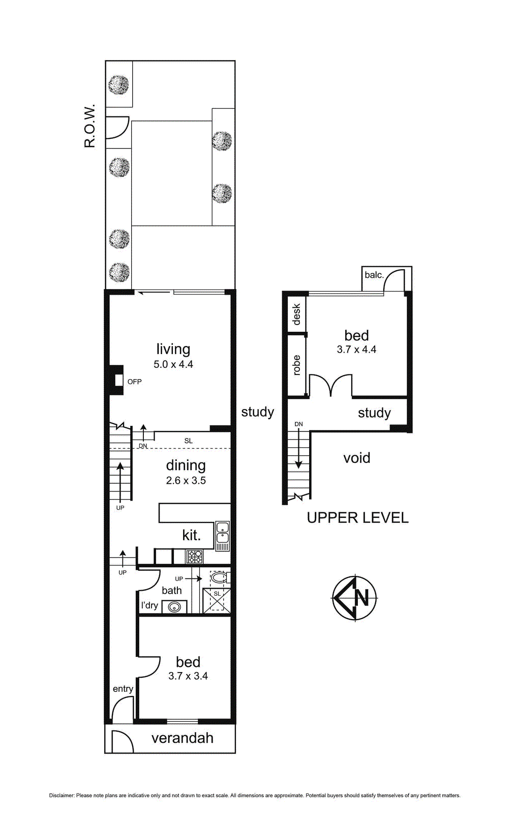 kitchen overlooking a bright open plan living and dining zone. From here, French doors extend to a lush, private courtyard garden — an inner-urban sanctuary with rear laneway (ROW) access, ideal for entertaining or peaceful retreat. Upstairs reveals a
