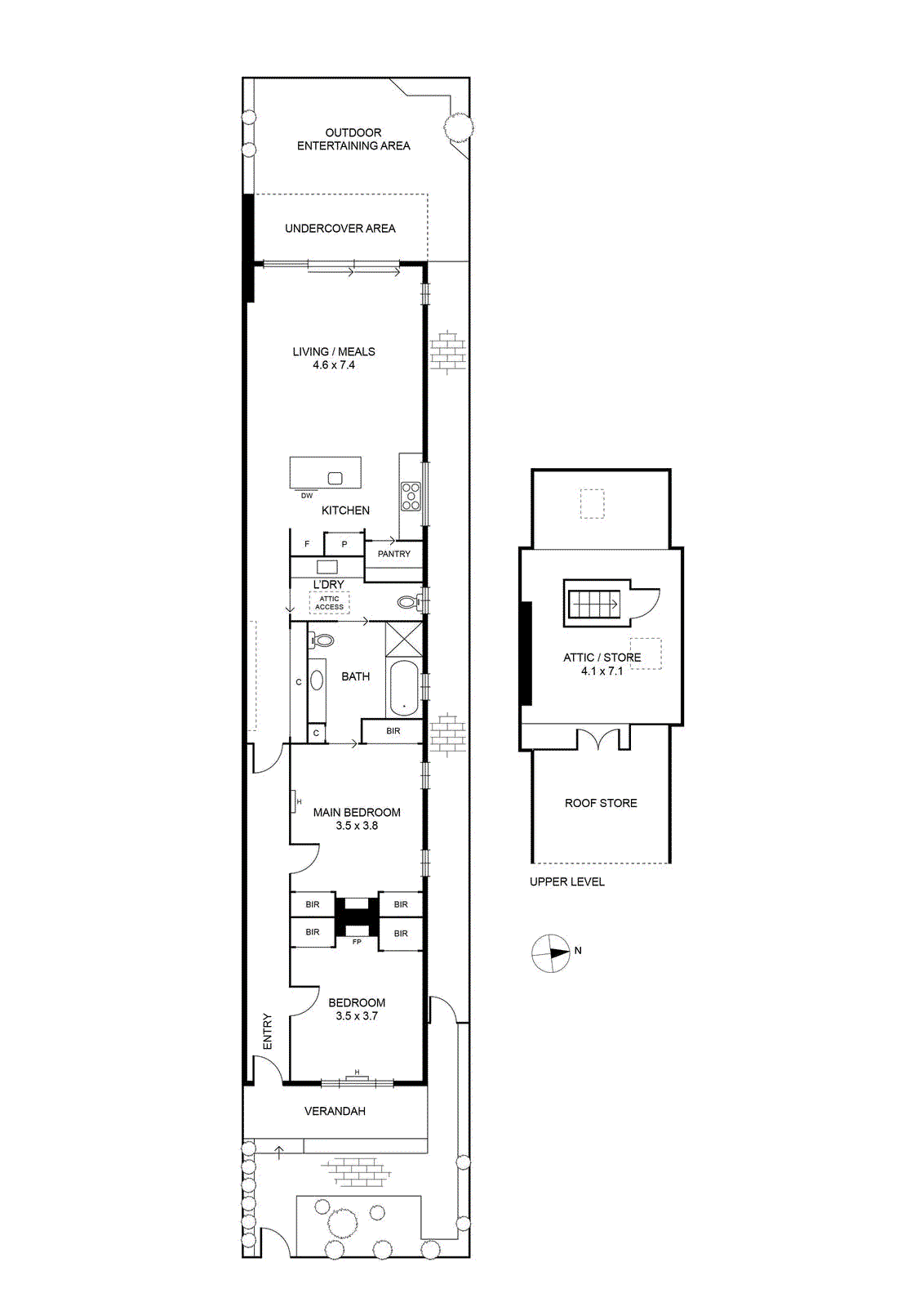 As attractive as it is practical, a well-worked interior distinguishes original accommodation from extended main areas, with Baltic pine stepping to polished concrete to mark movement to modern. A lengthy skylight, northern feature windows, and high oak-board ceiling foster an ambiance of airy chic, while full-height stacker glass sees an open living/dining domain and wonderfully private backyard merge for seamless indoor-outdoor hospitality. Ribbons of granite, a walk-in pantry, integrated fridge/freezer, and Asko oven, gas stove, and dishwasher all feature in a first-class kitchen, while a marble-laced bathroom’s walk-in rain shower and bathtub join robes and fireplaces in enhancing two large bedrooms. Equipped to deliver low-maintenance luxury long into the future, other highlights include a fully lined attic ideal as an office or teenager’s escape, electric block-out blinds, sheer curtains, hydronic heating, split-system heating and cooling, a hallway skylight and floor-to-ceiling cabinets, alarm, marble-top laundry, extra WC, and ornate details accentuating period appeal.