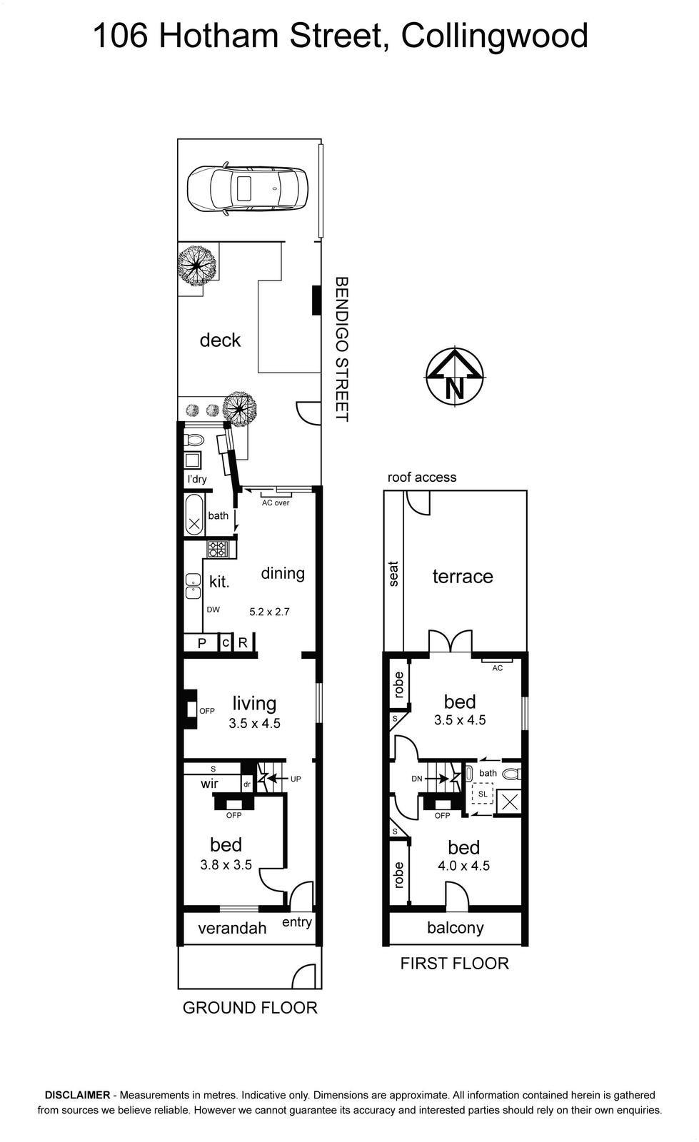 Split system units feature throughout the home for guaranteed comfort. The downstairs bedroom with built-in robe makes a fabulous main or formal study, while upstairs adds two further large bedrooms with built-in robes and a sleek two-way bathroom to share. One of these bedrooms opens to the wide front balcony with glimpses of the city skyline, while the other features a large fully-decked balcony for a wonderful rooftop entertaining space to enjoy. Below is the decked backyard for even further fantastic alfresco space, perfect for a BBQ with friends and family. Secure side access is available via Bendigo Street, including a lock-up roller door for secure off-street parking at the rear.
