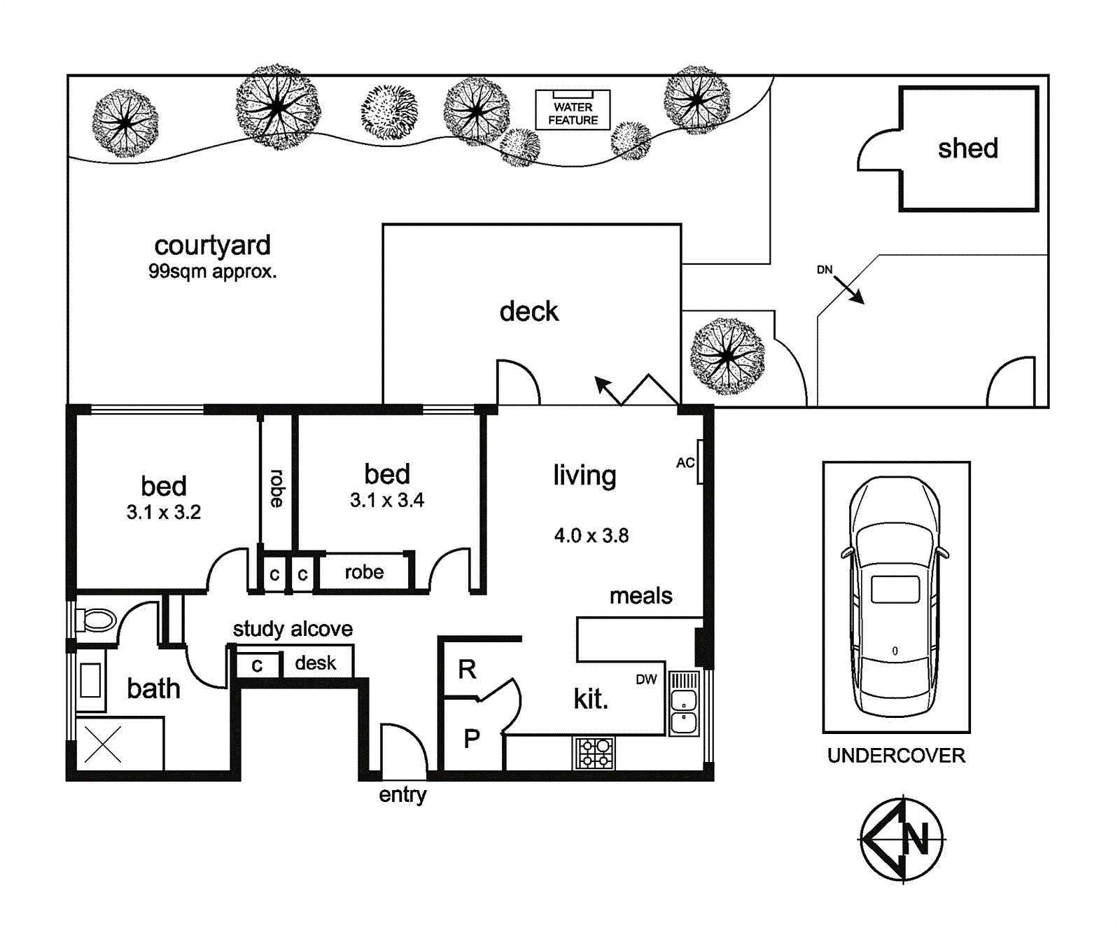Two robed bedrooms offer generous space for rest and retreat, including a king-sized main bedroom, while a handy study nook enables home-based work with a bespoke desk and cabinetry. Finished with a contemporary bathroom with separate WC, split-system air-conditioning, plenty of storage, and a carport, this ex