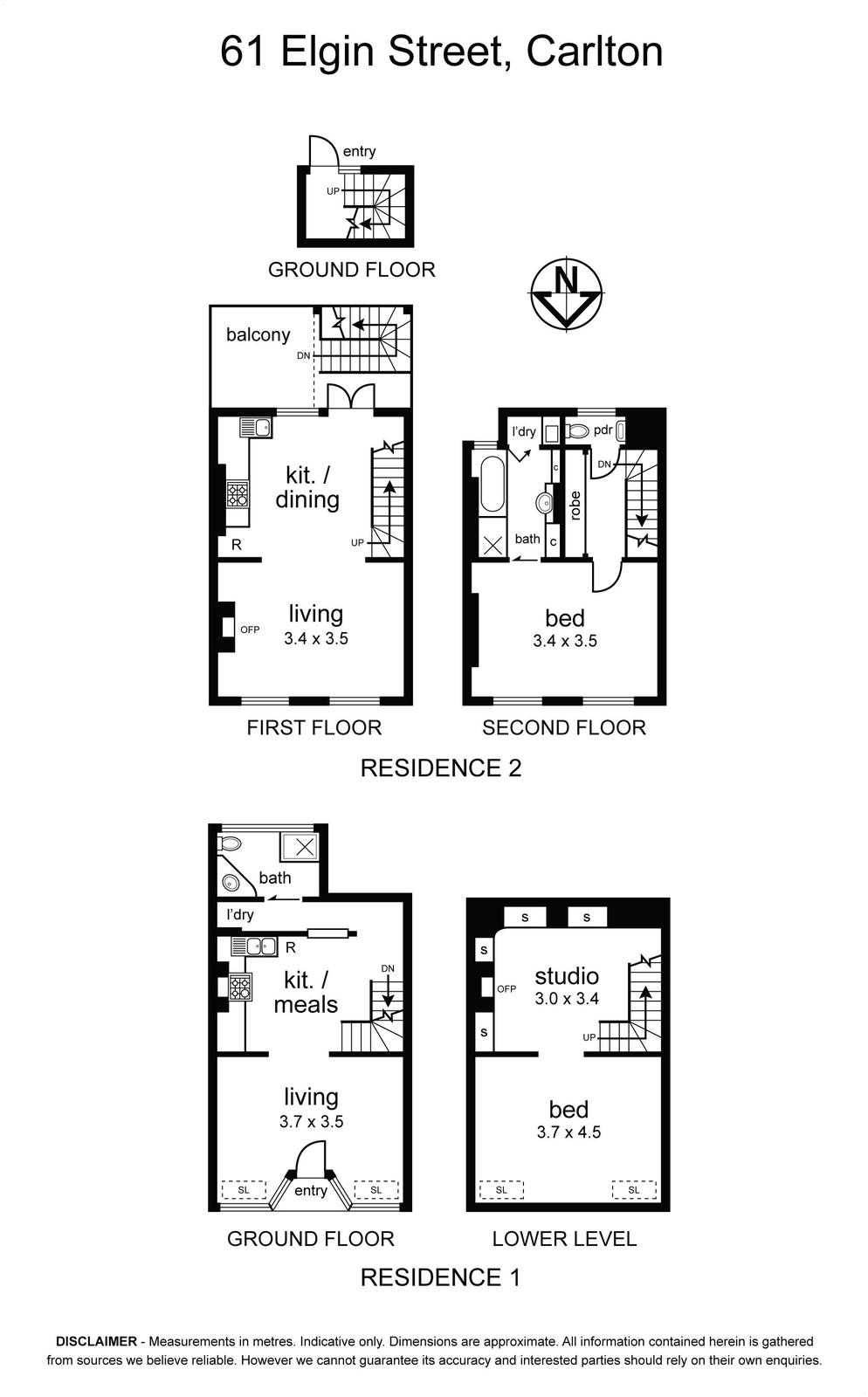 Accessed separately via Nicholls Lane, the upper residence (61A Elgin Street) enjoys a private first-level terrace that flows via French doors into a north-facing light filled living zone encompassing the entire level with ornamental fireplace, and modern Caesarstone kitchen with stainless steel DeLonghi appliances. Upstairs, the spacious bedroom includes built-in robes and is serviced by a pristine bathroom featuring a bath, shower and separate w/c, along with a dedicated laundry.