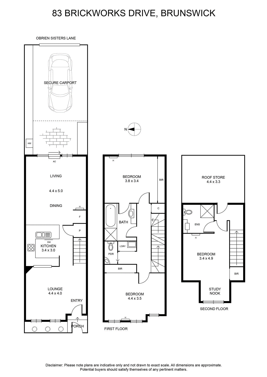 Designed for flexibility and everyday ease, the ground floor features two distinct living zones divided by a central kitchen—ideal for both open-plan living or more private, separate spaces. The layout flows seamlessly to the rear, where a secure carport with roller door access via O’Brien Sisters Lane provides both convenience and peace of mind.