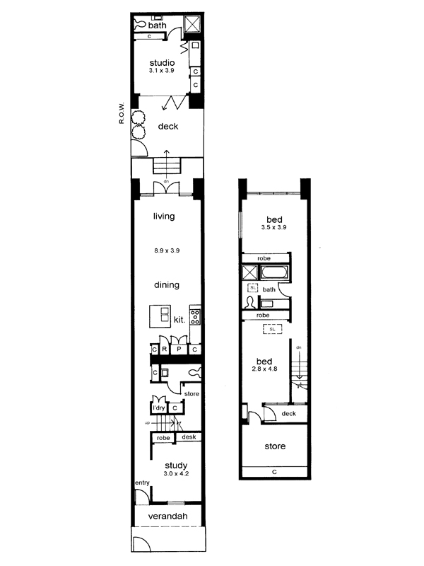 Security-system entry from the stone tiled courtyard is to a wide hallway, floored - like the entire lower level - in mellow recycled messmate. A cut-out wall opens into a roomy study with custom-built cabinetry. Past the wide staircase to the upper level are a laundry with drying cupboard, and a powder room. The open plan kitchen and living area is a stunning space, opening through a wall of multifold doors to a private deck and courtyard. The meticulously designed kitchen features 'Cantilever' sustainable joinery, and Miele and Barazza appliances. On the upper level are two well separated bedrooms (one with an adjoining storage room) and an elegant fully-tiled bathroom. The polymer resin screen to the main bedroom provides both privacy and a feature wall to maximise light. Ply ceilings and quality sisal carpets contribute to the effect of natural warmth.